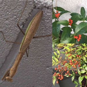冬の使者 毎年この時期になると茶色のカマキリが訪れます。 庭の中だったり、花壇だったりじっとして動きません。 だんだん現れる場所が玄関灯の下になり玄関の壁に貼り着きます。 その前の虫が活躍している時はほとんど見ません。 昨日、駐車場の屋上で逆さまになって動かないカマキリを見ました。 センリョウ、マンリョウ、ナンテンも日当たりのいい所から赤くなってきています。