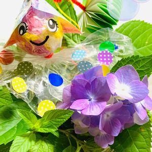 雨降りの日はてるてる坊主ちゃんもがんばりすぎないでおうちでゆっくりしてください💜昨年、挿し木した紫陽花さん、小さいですが咲きました💜おうちにご招待🌈