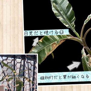 斑入りバナナ🍌アエアエ🍌 遮光しても葉焼けが酷くてかと言って室内LEDでは育たない😭 どーやったら葉焼けせずに成長するんだろうか😭葉焼け無しだとめちゃくちゃ綺麗です😍