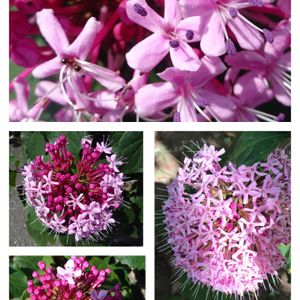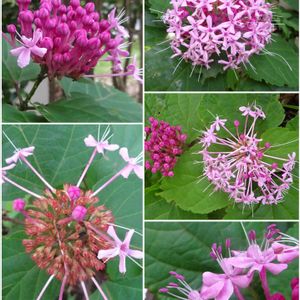 おはようございます😃 ボタンクサギ(牡丹臭木) シソ科クサギ属 左上 蕾 右上 ほぼ満開 左下 花殻 一本の木で 色々な状態で 咲いていたのが面白くて。 散歩道で 7月3日 メモ 右下 花冠からは、4本の雄しべと1本の雌しべが伸びています 雄しべの葯は紫色。 花びらは、開花時は幅広。だんだんと外側にめくれて幅細になっていく。