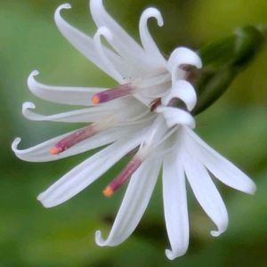 キチジョウソウ 庭の奥の片隅で、ヤブランに似た葉の間から今年も花を覗かせているのは5株🩷 栄養が足りないのか、実をつける両性花は少なくて、ほとんどが雄花のようだ🔴 雄しべ6個、数少ない両性花の中で、撮せた雌しべの柱頭は、3つに分かれている△ 当然、チームうずくまり🏷になって撮すのだが、この時期はヤブ蚊もいないので、少し楽(^_-) 地面につけたヒザのあたりは、湿った土で汚れてしまうが… 短い花茎に蕾をつけて、下から咲きあがっていく金曜日の蕾たち🏷