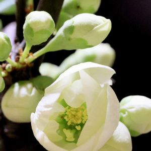 木瓜の花🌸 ほぼ満開となりました♪ 背景は窓越しに見える雪の壁です☃️