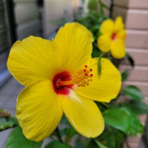 ご近所さんちの玄関前で咲いています🟡 刹那の美しさを謳歌しています(バッタくん邪魔❕️)