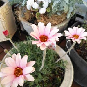 やっと昨日黒ポットから鉢に植えてあげたローダンセマム🌸 アプリコットジャムこれから春になったらもっとモリモリに咲いてくれるかな😀 楽しみ🎶