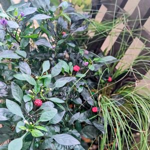 今日のお花🏷️の、トウガラシ。これは去年からの寄せ植え、冬越し組の観賞用トウガラシ🌶️。 紫色の花が次々と咲いて、赤い実もできています。 去年モニターした、アルテルナンテラ コタキナバルはまだまだ緑色。大きな株になりました。 一緒に寄せ植えたヒューケラは、単独植えで休養中。夏の暑さに弱い😅。 今日は休み。ゆっくり大谷選手の応援だぁ📣。ドジャース勝ちますように🍀。 (2025/9/4撮影)