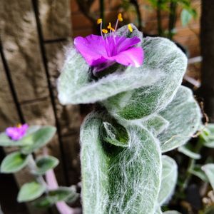 おはようございます:.゚✾☂・゚・。 玄関前で癒してくれます🩷 🌸トラディスカンティア 白絹姫(シラモンタナ)🌸 友人宅に珍しいモフモフの葉っぱ🌱が いっぱい出てたのでカット✂️して お持ち帰り…挿しておきました🪴 昨年から可愛いお花が見れるように なりました🥰 最近はHCでも見かけます💕🎶