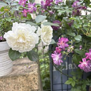 我家で1番元気な ななちち印の つる薔薇 ファイルフェンブラウ💜 冬に剪定したけれど春に枝が伸び伸びになり慌てて支柱を立てただけ😅 この冬は誘因とコラボさせるバラを考えよう 同じ時期に咲くつるバラが良いですよね😊