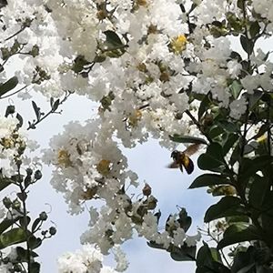 ちょうどひと月前の撮影 今も咲いているサルスベリの花、の間を行き来する、ハチさんです。 🏷8のつく日は蜂の日 近所ではハチもなかなか撮れません💦