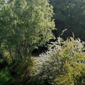 庭先のコデマリがやっと咲き始めました 五分咲きってとこかな? 雲龍柳も綺麗に葉を出しました 後ろはトトロの森です
