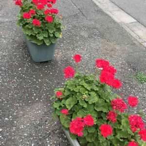 去年挿し芽したゼラニウム、駐車場に置きました。無断で止める人がいるので! ( *`ω´)