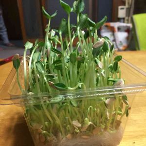 どうですかこれ!😋 メロンのタネでかいわれを作ってみました!実食! うっ、苦い、ぺぺぺっ👅うぇ!げっ! だめだこりゃ👎 インコにあげます。∧( 'Θ' )∧