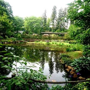 おはようございます☁️ 津軽おのえ温泉福家 玄関先に水琴窟 水に写された木々 優しい水音に癒されました