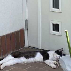番外編 今日の野良クロちゃん❣️ 僕はこのレンガ🧱が冷たくて気持ちいいから、爆睡してしまったニャ〜 写真撮られているのにも気付かニャかった!大の字?で爆睡してしまったニャ〜 この子、このドアが突然開いたら ビックリ‼️するんだろーね❣️