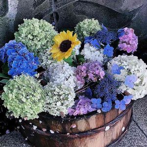 昨日の「風鈴まつり🎐」 紫陽花💙💜🤍とひまわり🌻 花手水です💠 とっても涼し気です•*¨*•.¸¸☆*・゚