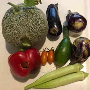 今朝の朝どり、そろそろ夏野菜もピーク終わりかな、メロン🍈の苗木も処分し始めてアンデスメロン🍈も終わりにしました。