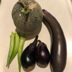 今日の収穫。メロン🍈まだ早そうだけど、つる枯れで仕方なく収穫😅 もう一つのアンデスメロン🍈 クインシーメロン🍈 ゆうかメロン🍈 の3個は葉っぱも蔓も旺盛元気、もう少し様子見ながら育てます 今頃の水やりは難しい🙄オクラと、長茄子は葉っぱが萎れ、物置の陰に移して水やり😬 昨日は千両🍆がたくさん実がついているせいか葉っぱ萎れて😰今朝収穫したのはそのナスのプランターから🙄