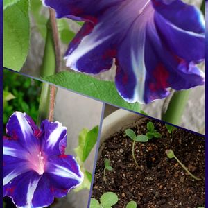 💜アサガオ観察記④ (肥後の手まり) 今朝は2個 8番目9番目の開花です💜 🍉スイカの苗 食した後の種をまいておいたら 可愛いい芽🌱🌱 鉢替えの予定!!初めての試みです♬•*¨*•.¸¸♪♥*⠜