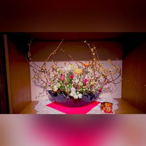 ✨お正月用 メインのお部屋 のお花です✨ 花器🎵が横に長いので 生けにくいんですが ゴールドの お月様✨(三日月🌙) は、お気に入りなんです ロウバイ✨も たくさん入れてますが わかりにくくて ごめんなさい⭐ スポットライト🔦が あたるので 見にくいですね➰💓