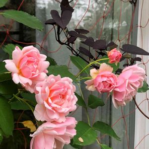 台風の影響で雨☔️ですね〜 せっかくのお休みですが庭遊びが出来ない 😮💨恒例の(?)家の中から裏側パチリシリーズ ルリマツリとノワールの葉のコラボ😊ハート💕でほっこり癒されています
