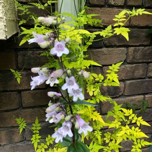 ペンステモンハスカーレッド株分けっ子 &ジャスミン支柱は雨樋😅 小さな小径ラベンダーラッシーの隣になります ピントがジャスミンの方に合ってる⁉️ ぼやけてごめんなさい🙇♀️