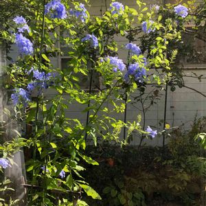 今朝のルリマツリ 家の中からおはよう😃 シェード通路ガーデンには まだ日が当たりません これから厳しい暑さになります 負けないで咲いてね💕