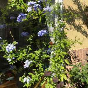 ルリマツリ💙 暑くて家の中からカーテン越しにボ〜ッと外を眺めたら おお‼️緑のカーテンになってる⁉️レースカーテン開いて なってるよね❓キレイじゃないのぉ😍💕 エアコン冷え冷えの中からゴメンね💦 お休みの日に見事に咲いてくれてありがとう🪴💕 夕方たっぷりお水あげるね⛲️