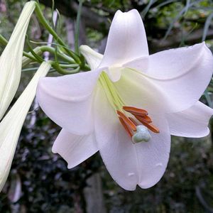 今日は一日降ったり止んだり… 雨の止み間に 今朝咲き始めた新鉄砲百合を 写しに出ました 真っ白で美しいです!