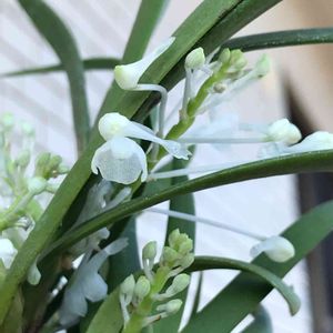 ポタンギスがまた咲いてくれそうです💕 剣のような葉と半透明の小さな白花、アフリカの着生蘭です