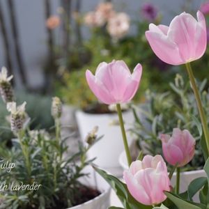 チューリップ🌷 フレンチラベンダー🌸 ☀️23℃/13℃ 気温はたかいのですが、ここ何日も風が強くてお花が煽られてしまいます。 𖧷 昨年の秋にチューリップ🌷の球根を6鉢に植えました。(昨年の10/17投稿) 冬越しをして今か今かと待ちわびて…. 咲いたチューリップ🌷が袋の写真のとはだいぶ違う感じ💧 そして咲かないものや高さもまちまち💧 思っている以上にチューリップ🌷って理想系に咲くのは難しいと実感(*´`)