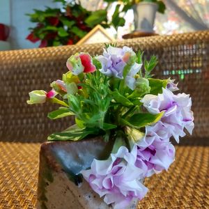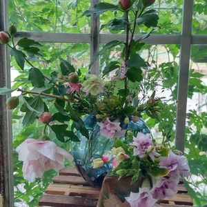 剪定したムクゲ、切り戻ししたペチュニアとニチニチ草をガラス鉢とミニ花器に💐