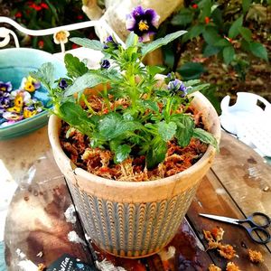 初めてにしては上出来だろー👍 両脇のビオラまだちゃんと咲いてないけど ブルーだよ〜💎.•*¨*•💙✨ やっぱ!!鉢の色は濃いグレー色がよかったかな……