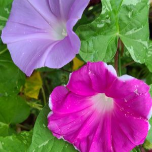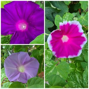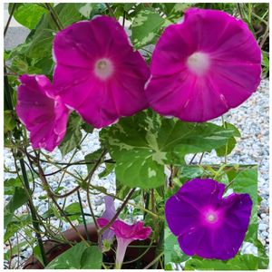 こんばんは😃🌃 今朝雨模様の中 咲いていた朝顔 浜の混合。 6月に、種蒔きしました。 後3つは、雨に濡れて花が、乱れてました。 また、明日は、雨に濡れない軒下に、移動したので、きれいな花が見れるかな? 花がらは、摘みました。