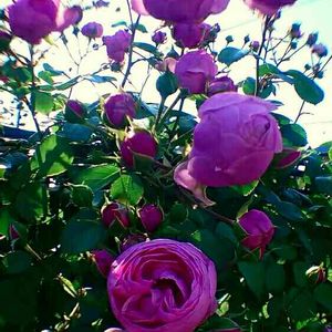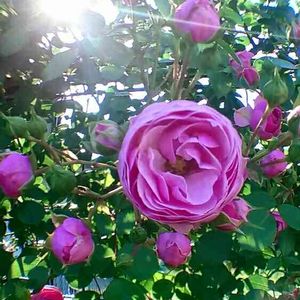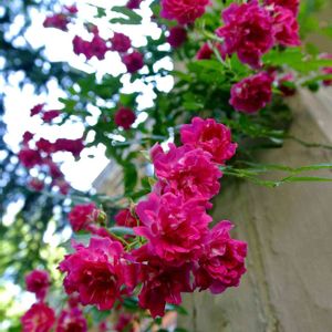 Super Excelsa ベランダ脇の柱に絡ませています。 鉢だし、モミの木で日光を遮られているけれど、沢山の花をつけてくれました💗