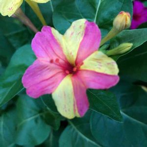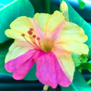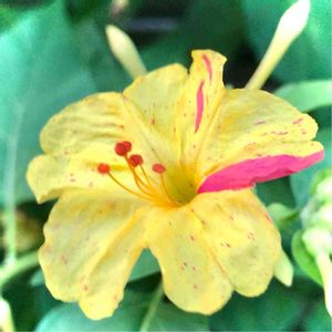 オシロイバナ 白粉花(オモシロカワイイシリーズ) 夏から秋の午後4時ごろから咲くため、英名では開花時刻を示す"four-o'clock“と呼ばれています。 (夕方から翌朝10時ごろまで咲いています。) このオシロイバナさんも夕方4時過ぎに撮りました。 でも、お花の顔時計では2時10分、秒針は0秒?? 🕑|* ̄∇︎ ̄|ニヤッ 🏷オシロイバナ愛好家友の会