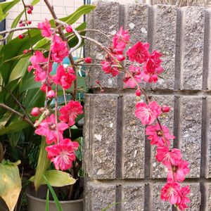 シダレモモ(鉢植え) こんにちは😃 本日は枝垂れ桃です🤗 花言葉は「愛の幸福」と言ったピンク色にふさわしい花言葉 昨年、シダレモモが大きく育ち、鉢にヒビが入ったので、おきめの鉢に植え替えました。今年も花をいっぱい咲かせてくれて、見ごたえ十分です。