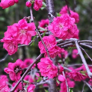 シダレモモ 枝垂れ桃(シダレモモ)の花言葉には、「恋のとりこ」「よい気立て」「愛の幸福」「天下無敵」などがあります。 【花言葉の由来】 源平枝垂れ桃は、平安時代の源氏の旗(白)と平氏の旗(赤)を連想させることから、「恋のとりこ」「よい気立て」という花言葉が付けられました。 一本の木に、赤と白、中間の絞りの3色が混じって八重に咲く様子が特徴です。 「天下無敵」という花言葉も付けられています。 【桃の花の縁起】 桃の花は、女性の愛らしさや秘められた強さ、子孫繁栄など縁起のよい植物です。また、長寿を司り、厄除けや魔除けなど邪気払いの木であることも、桃を飾る理由の1つです。
