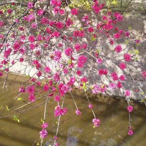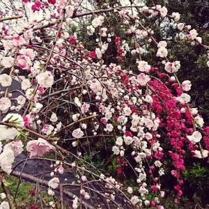 庭に咲く、一本の木で、紅白の花、しだれ状に咲いていました。