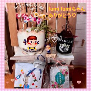 おはようございます♪ 先週fumi fumiちゃんから素敵便が届きました🎁 ペコちゃんのリメ鉢、かっこいいリメ缶、ミルキーのピック、ワイヤーアートピック、ネックレス系多肉、おそろいのハンカチ、お茶🍵 ハンドメイドすごーい👏 どれも可愛くて嬉しい(*'▽'*) アーモンドネックレスさんは初めて見た〜 増やしたいです💕 fumi fumiちゃん♡たくさんの🎁ありがとうございます🥰 pic5 ベランダのアエオさんにケセランパサラン♡
