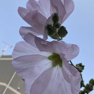 立葵 白い立葵が咲いてたのにほんのりピンクが咲き始めました。 太陽の下でベインが透けて綺麗〜