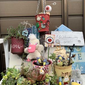 (*´・ω・)ノこんばんわぁ〜 fumi fumiちゃんからバラと夢CLUBプレ企画のお礼便が届きました〜😊 赤いJunkリメ缶2つと fumi fumiちゃんの作品って言ったら代名詞のワイヤーアート💕 お家🏠付きのワイヤーアートも😊 他にお菓子やキクラゲ入りシソ昆布も💕 ワイヤーアートは先日、わっしょい 輪ッしょい!プロジェクトの販売会 でお迎え出来たsora gardenさんの多肉弁当で寄せ植えしたfukumomoちゃんの🐍リメ鉢と前の回の同じくfukumomoちゃんのエンジェルリメ缶とえつこさんのカタツムリ🐌と紫陽花鉢(何故か本物🐌が鉢に付いてた〜💦)に挿してみたよ〜 挿したら一段とオシャレになるわ✨ ちょうど今日は8日で fumi fumi ちゃんのJunkリメ缶に 入っていた??ネックレスで 🏷ネックレスの日 fukumomoちゃんの🐍リメ鉢で 🏷毎月8日は鉢の日 で参加させて頂きます(*´˘`*) 2枚目 リメ缶はMyuuちゃん作 アーモンドネックレスとバナナネックレスが暴れています😅 3枚目 Haru.Kちゃんからもらったルビーネックレス、年中雨ざらしだけど💦 もりもり😊、 4枚目 ハツユキカズラのネックレス 白い小さな花が咲いています。 5枚目 先日るるちゃんからお礼便でもらったぞうさん🐘鉢💕 ちょっと遅くなったけど同時にもらった多肉とうちにある多肉で寄せ植え〜吊るして管理しようと思って 専用土のネルソル探してたら遅くなっちゃった(´>∀<`)ゝなのでちょっと徒長してます💦 隣、トワちゃんのリメ缶とえつこさんのミツバチ🐝࿆リメ鉢には一昨年のバラと夢CLUBのお礼便として 最近ななみちゃんから多肉弁当届いたので色々植えました。 もっと早い時間に投稿したかったけど💦久しぶりの仕事で今日は暑くて汗かいて仕事、何度か寝落ち💦 1時間以上かかっちゃった😅 文章が変なのはお許しください🙇♀️