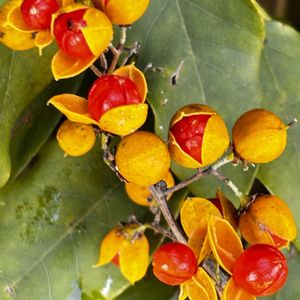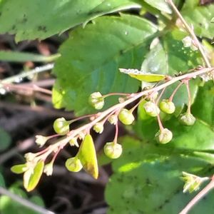 🌀落葉つる性木本🌀 雌株につく果実は痩果(そう果) で〰︎秋に淡黄色に熟すと〰︎ 3つに裂開し 鮮やかな橙赤色の 仮種皮に被われた種子が現れる🎶 蔓梅擬(つるうめもどき) ニシキギ科