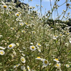 いつもの散歩コースを外れたら空き地にヒメジョオンの群生…🤍✨ こんなにたくさん咲いているのは初めて見ました😳 その中に150cmはあろう多分オニアザミ?が一本 花はまだでしたが鋭い棘が怖かったです😅