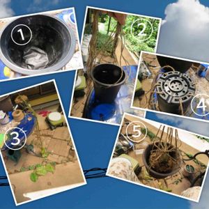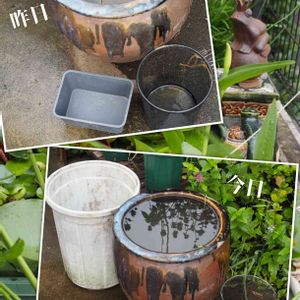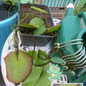何をやっているか分からんpicだと思いますが、熱帯睡蓮のギガンティア・ネオロゼアを小さい鉢に植え替えたんです8/10に ①「鉢に穴が空いてたら、塞げばヨシッ」(by tro師匠) 黒のショップバッグがあったので、それとビニールテープで塞ぐ ②「花芽があるか確認ヨシッ」(ネオロゼア師匠) 水深60cm以上なので、麻紐で釣り上げられる様に ③ネオロゼア様を植え付け、身体検査 浮葉8・水中葉2 ④植え付けした小さなプラ鉢は軽いので、浮く・倒れる可能性がある 後ろの穴に麻紐を通す(あ、これ植え付けする前の作業であった。修正面倒…このままでヨシッ) ⑤植え付けした鉢を陶器の重い鉢に入れて重ねる 重い鉢の穴から麻紐を通し、鉢の上でクロスさせ軽いプラ鉢と重い鉢を合体させる 軽い鉢に取り付けた麻紐もクロスさせた麻紐に縛りつける (•ө•)♡ ヤダ!ペキカン! が、8/10は灼熱地獄であった ネオロゼア様の負担にならない様に作業は短時間を心掛けたが、茎と葉がちょっと萎れた ちなみに今日は大変に涼しく、15時過ぎまで雨が降る事はなかったんです 今日やれば良かったやん!!と思い、ちょっとだけ泣いてます 8/10、軽く熱中症ぽくもなったしなぁ _( :⁍ 」 )_ ワタシ ソーユーコト ショッチュウ アルヨ… 撮影日:8/10