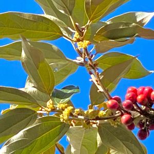 🌳ウスギモクセイの果実⁉️🌳薄黄木犀 金木犀だと思っていた木に果実ができています🥭 金木犀は江戸時代に中国から移入されましたが、日本には雄株しかないので果実は見られないとのこと。 銀木犀や薄黄木犀はごくまれに雌株が植えられていて実をつけるそうです。 本当に金木犀ではないのでしょうか❓ 2021.2.18撮影 《追記》 2021.9.13に花を確認・撮影 2021.9.16投稿 明らかに金木犀より色が薄く、まさに薄黄木犀だとわかりました💛💚