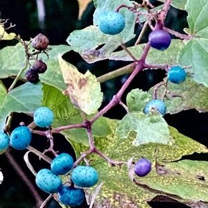 🌿ノブドウ🌿野葡萄 このノブドウは、誰も入れない丘陵地の縁にあり、ウワミズザクラに絡みついています。 綺麗に色づくのを待っていたけれど、雑木林のせいで日が当たらずこれが限界。