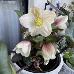 冬のベランダ…🥀はおしくらまんじゅう状態で日向ぼっこ🤭その他のお花達は、冬場は早くから夕方まで日が差し込む南側の室外機上で花盛り╰(*´︶`*)╯♡ クリスマスローズは、どちらも葉が硬くしっかりした株のよう。暖かさに誘われて満開を迎えてます🌸 備忘録まで…