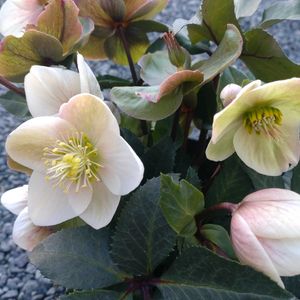 こんにちは♪ 陽が射さずどんよりした空☁️ やはり冬ですね この夏の猛暑でたくさんの宿根草を枯らしてしまいましたが、我が家の数少ないクリスマスローズも半分以上が⭐️に‥😢 環境づくりが課題です💧 寂しいので今季加入した子達 ①〜④シューティングスター(大苗) クリーム色〜ピンク→グリーンへ色変が楽しみです😊 葉も素敵✨ ⑤ステルニーロッキーズ(子苗) こちらは今季あずき色の花は観れないかなぁ 花がなくてもギザギザの切れ込みが入るシックなシルバー(ブルーっぽさも)の葉に軸の赤がとっても魅力的です😌 暖かくして楽しい時間を♡