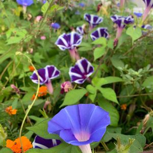 おはようございます😃 暑さ落ち着いてきました 遅咲き朝顔 今日は 集まって咲いてくれました