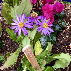 今日の花 🌸💖💜💜💜 葉っぱの大きさを示す為に割り箸を刺してみました🤗😃 花の名前をもう一度確かめてみたいと思いました😊 大きな植木鉢に咲いています😊 後ろにはガーデンシクラメンが植えて有ります🤗💖💜❤️💝💖🧡💚💚 🏷チーム.ブルー