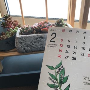 🏷カレンダーの日 プレゼントキャンペーンで頂いた『点字付UDカレンダー』2月はオリーブです🌿 昨年100均からお迎えしたマッコス、ルエラ、ラズベリーアイス鉢植え🪴 葉挿しっ子セダムと一緒にパチリ📷✨